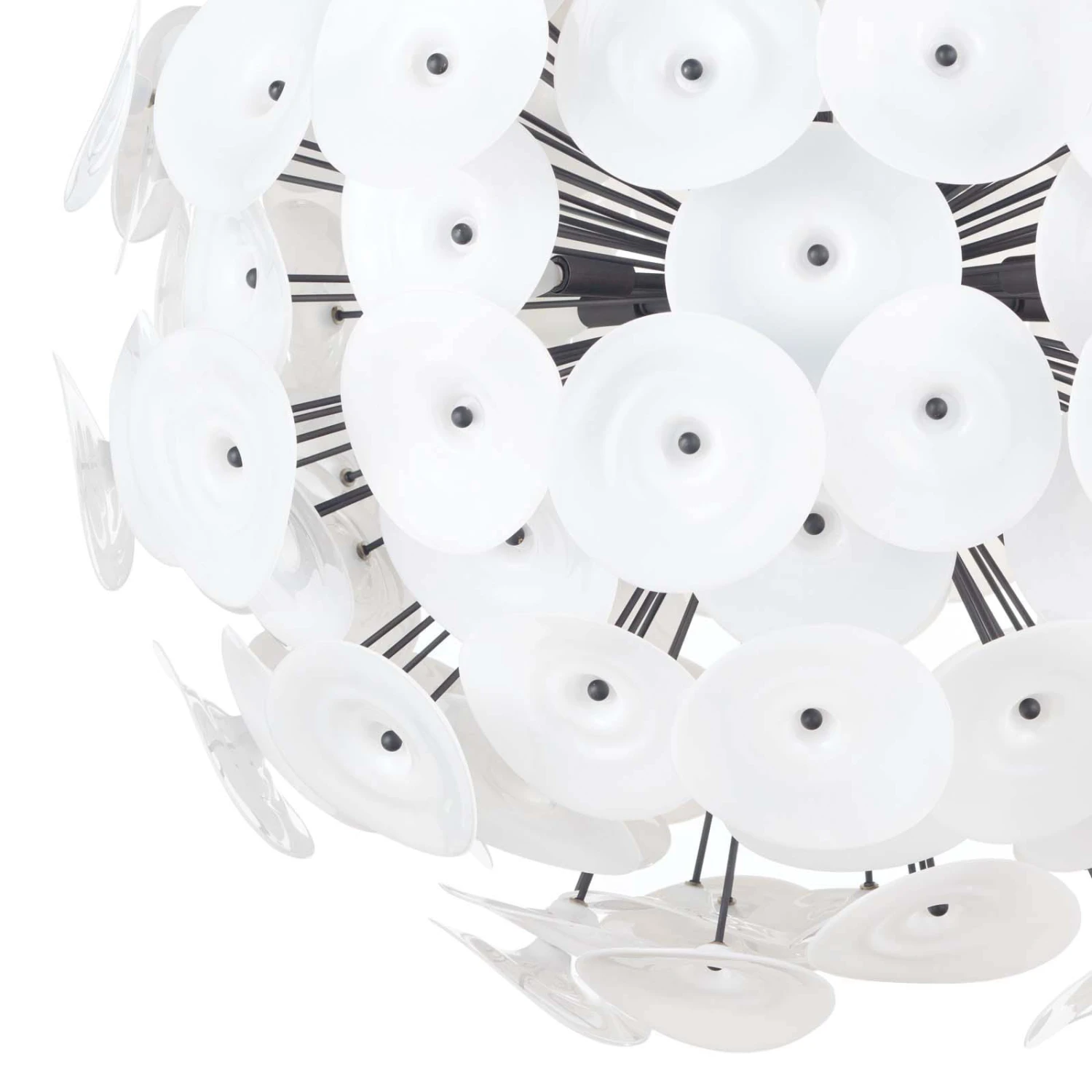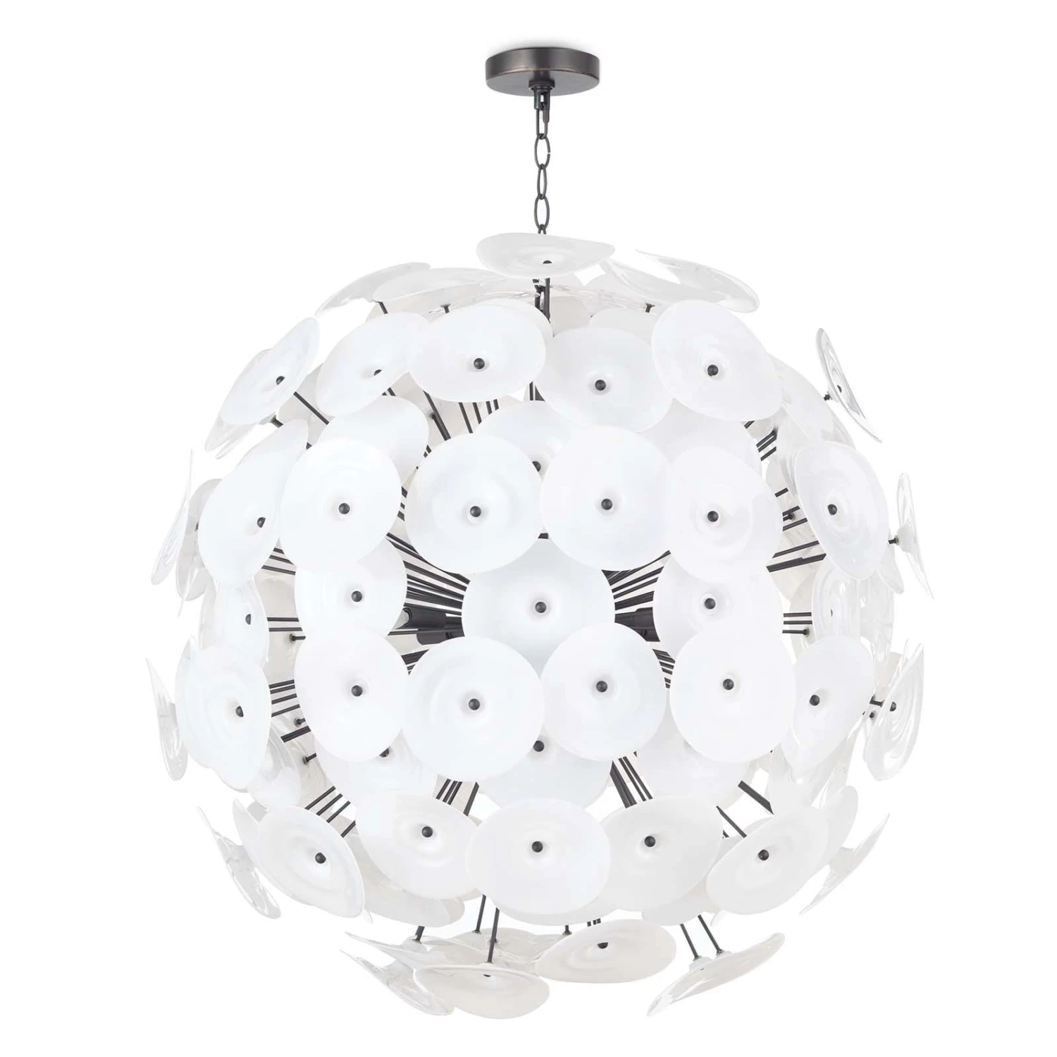 Scores of white glass discs, distended at varying depths, give this Sputnik-style chandelier its distinctive flair. Both glamorous and whimsical, its certain to command attention even when it’s not turned on.