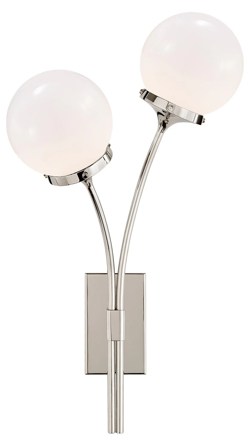 Fixed to a polished nickel backplate with two arcing arms and glass globe shades, we love this sconce for flanking either side of the bed. Hardwired.