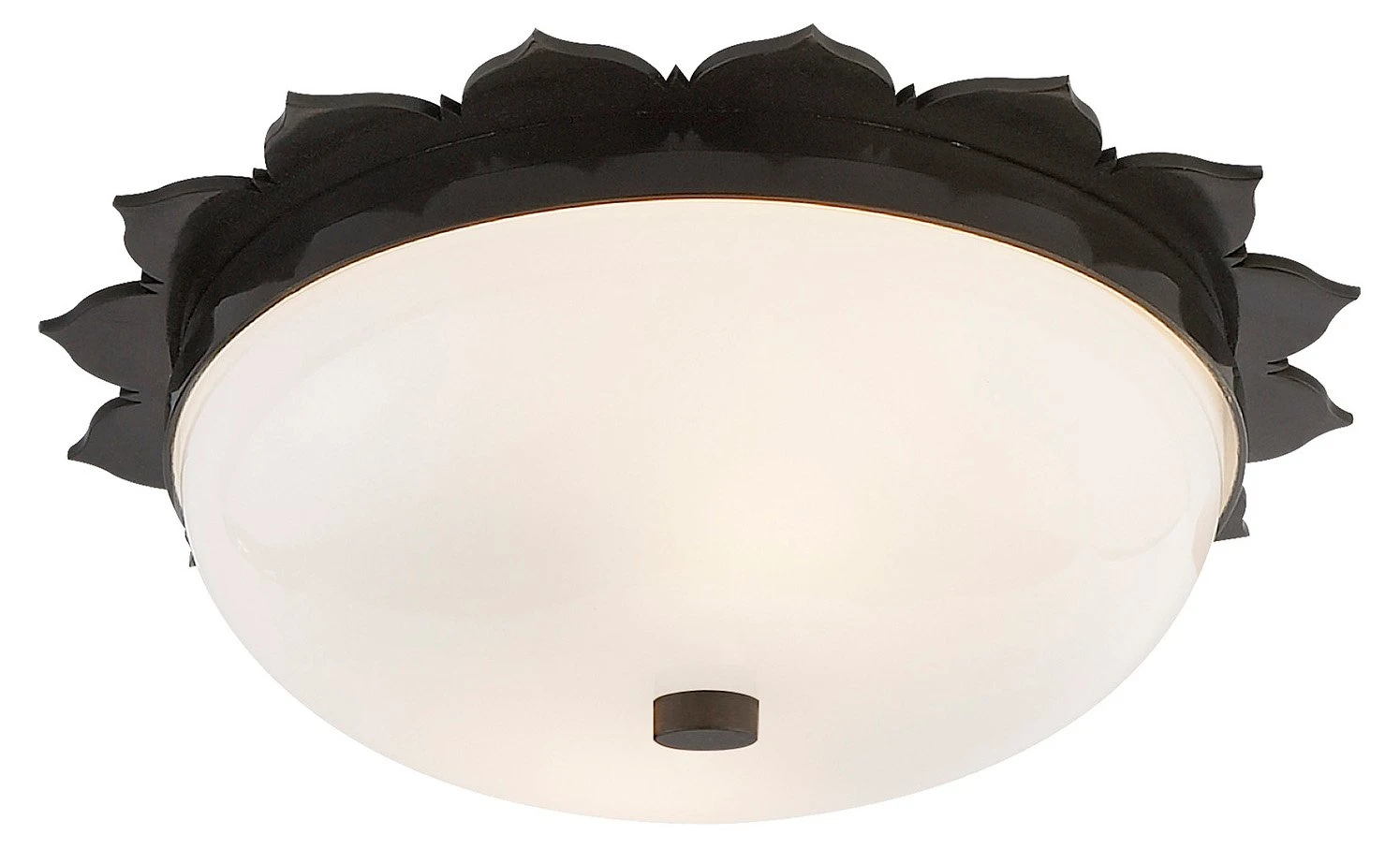 An elegant design with a gentle deco influence, this flush-mount fixture is exquisite in brass with a gunmetal finish. Hardwired.
