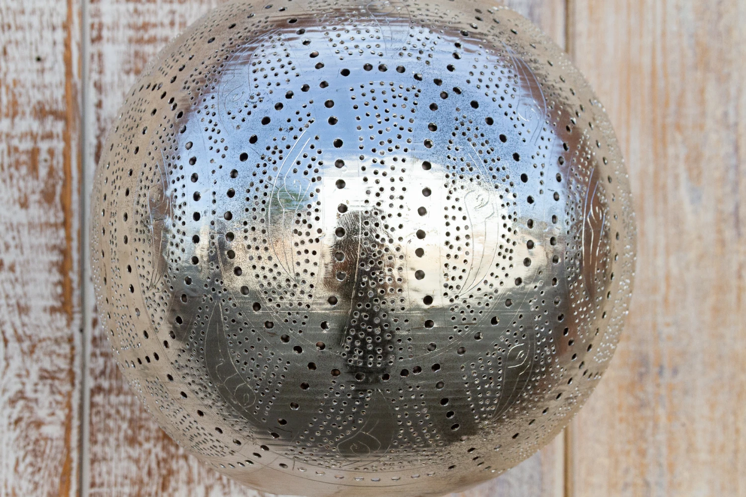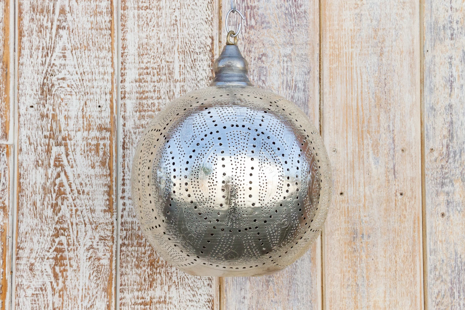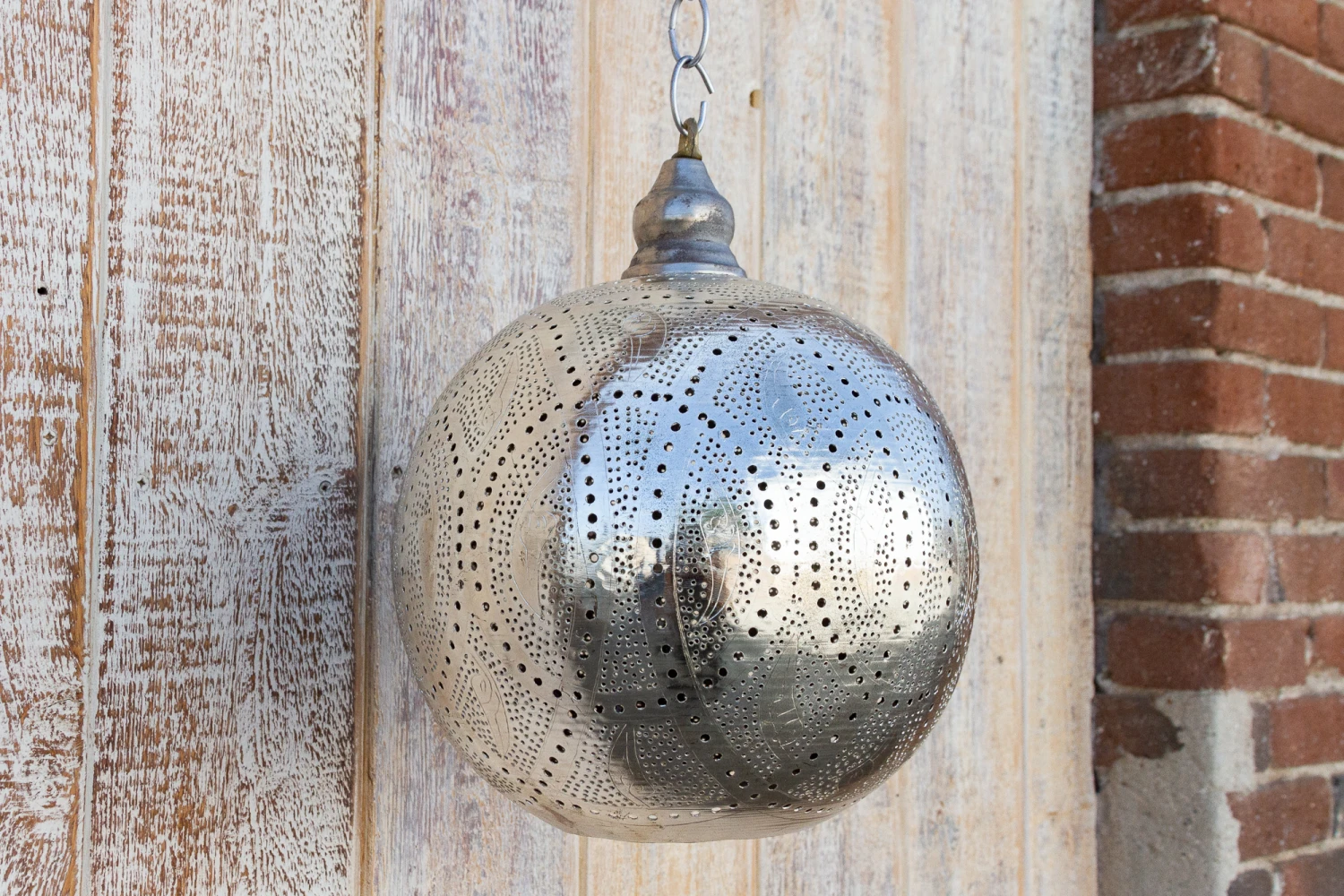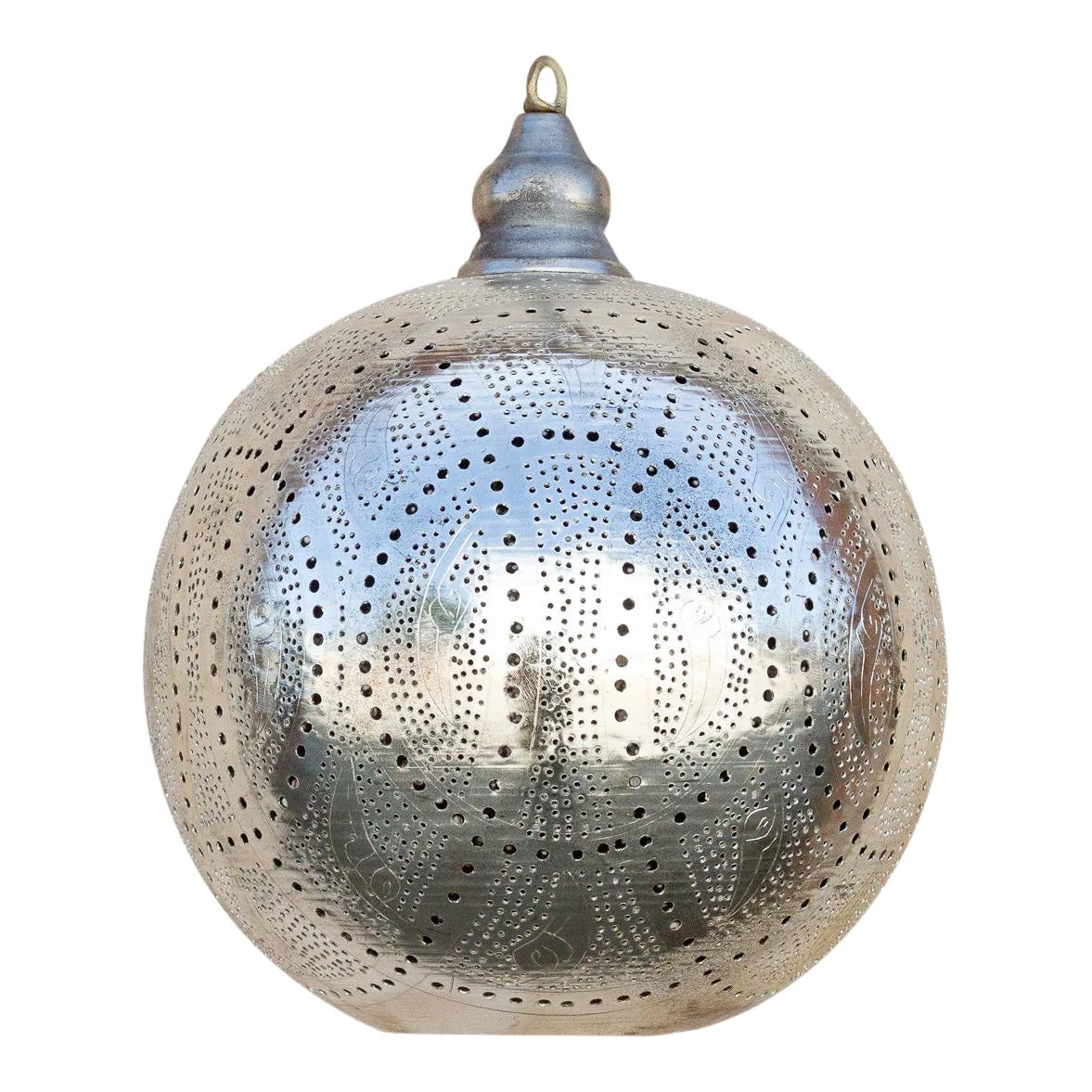 A delicately perforated Moorish pendant lantern. This pendant features pierced foliate see-through work which is all done by hand. When wired for light this lantern features open lattice geometric work that cast shadows on the surrounding space and emits a radiant silver glow. Please note, lantern does not come wired and light kit and bulb are not included.