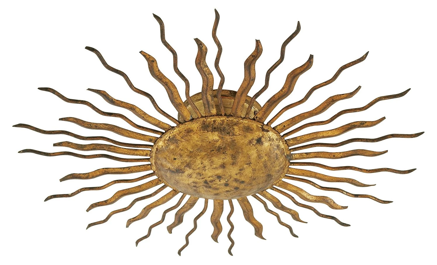 This exuberant sun in a gilded iron finish will bring radiance to your room. Hardwired.