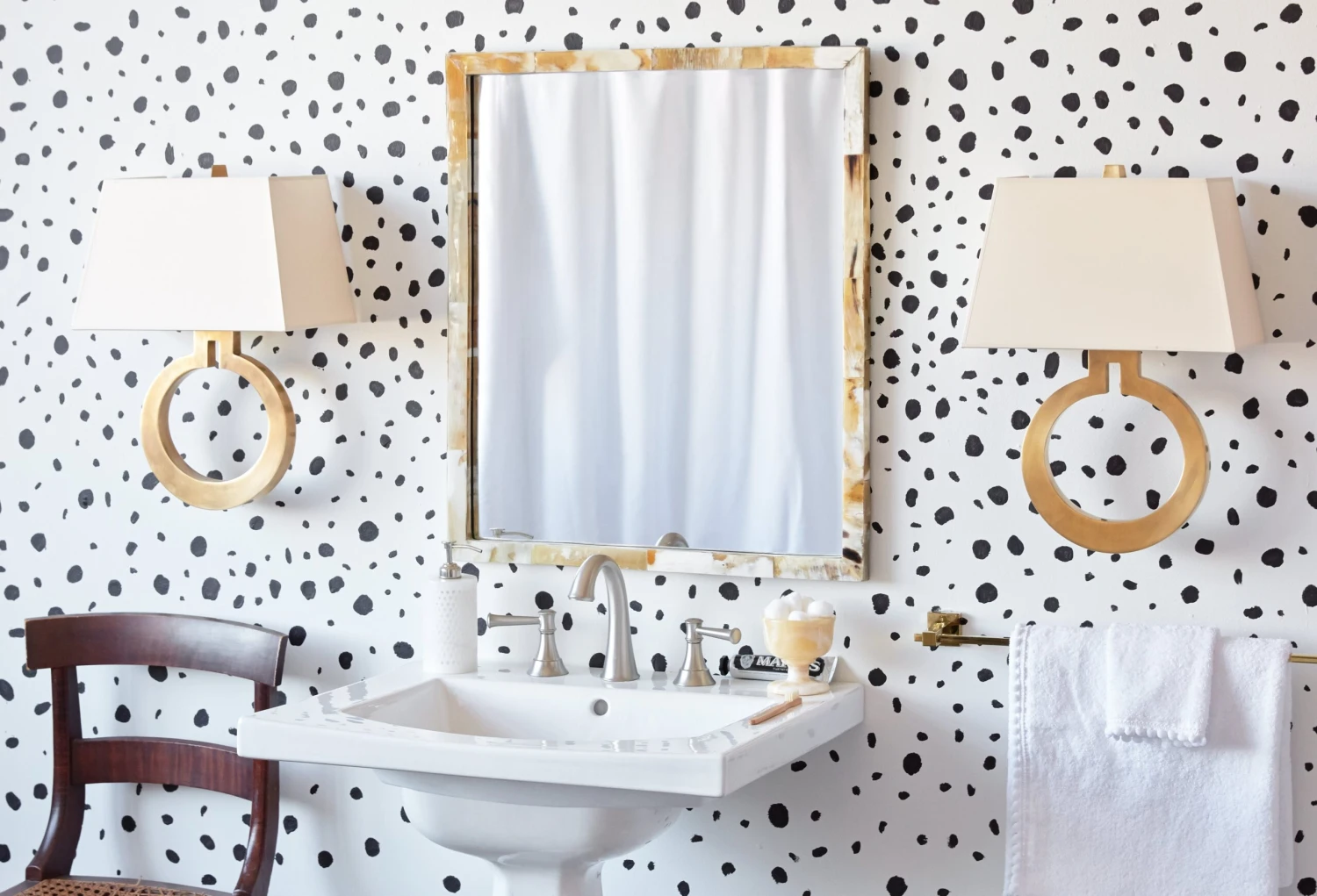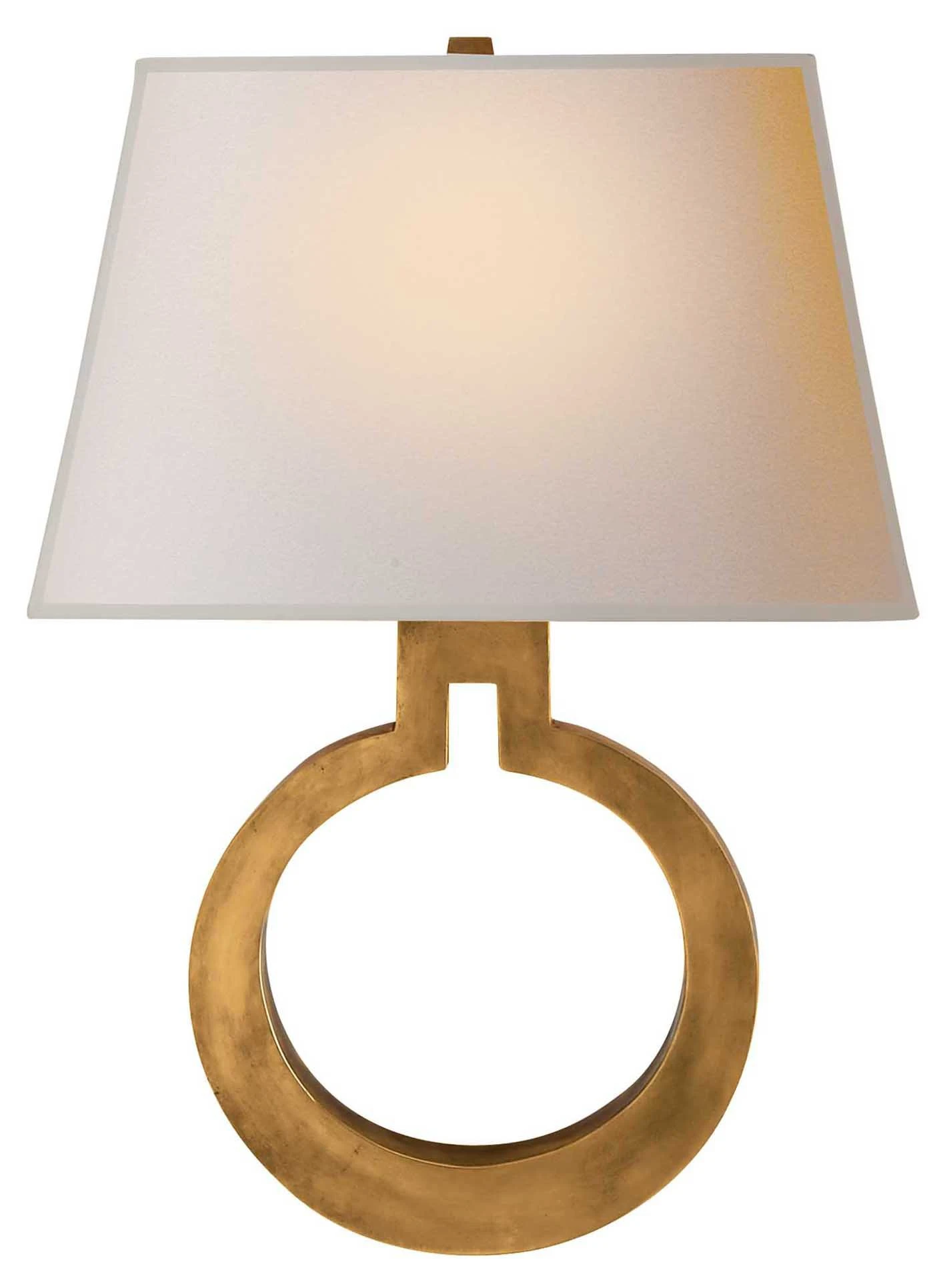 This brass wall sconce offers a fresh take on a classic look. Topped by a simple paper shade.