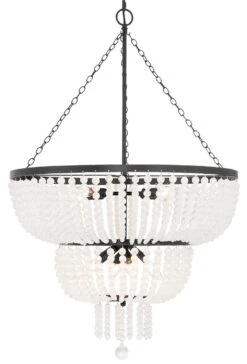Hundreds of frosted glass beads adorn this sweeping chandelier, beautifully offset by the fixture’s matte black finish. Hardwired.