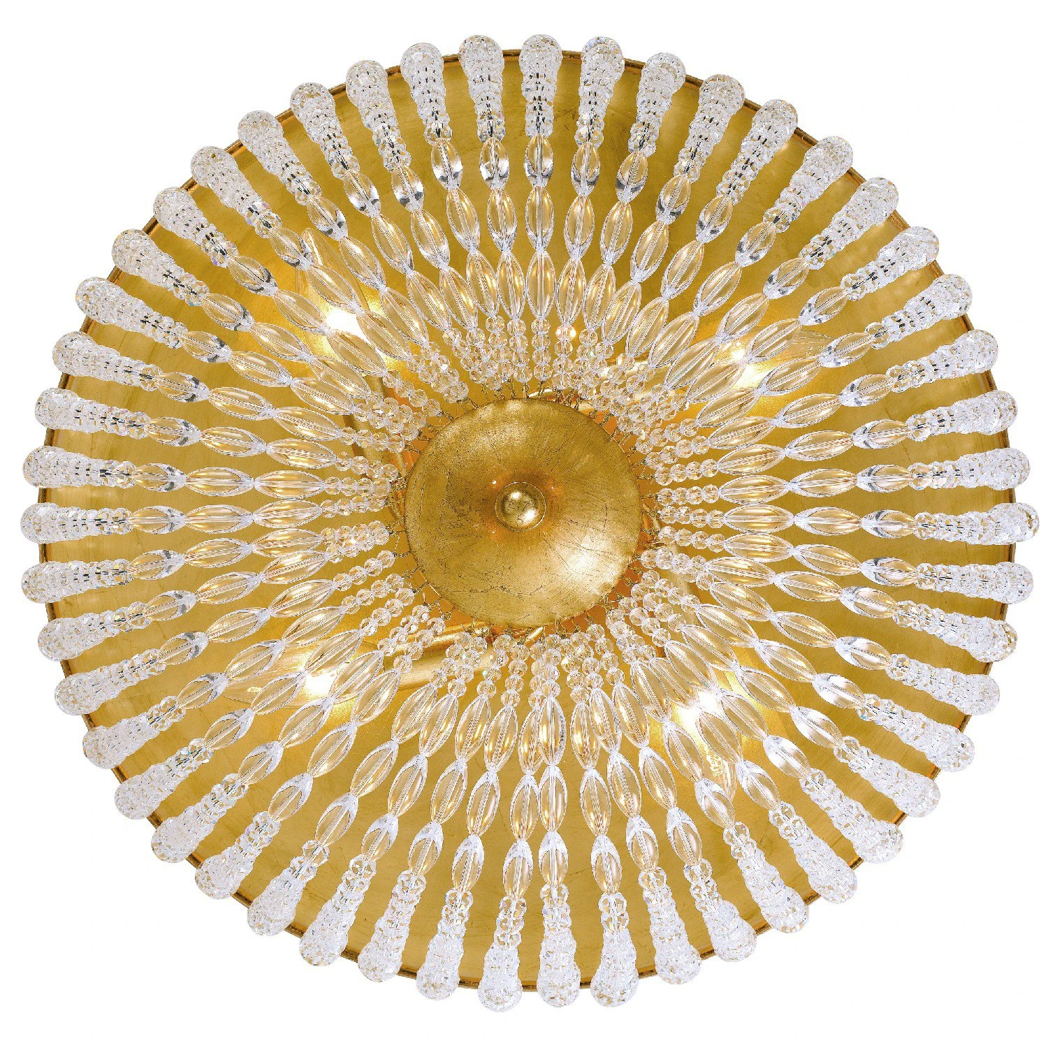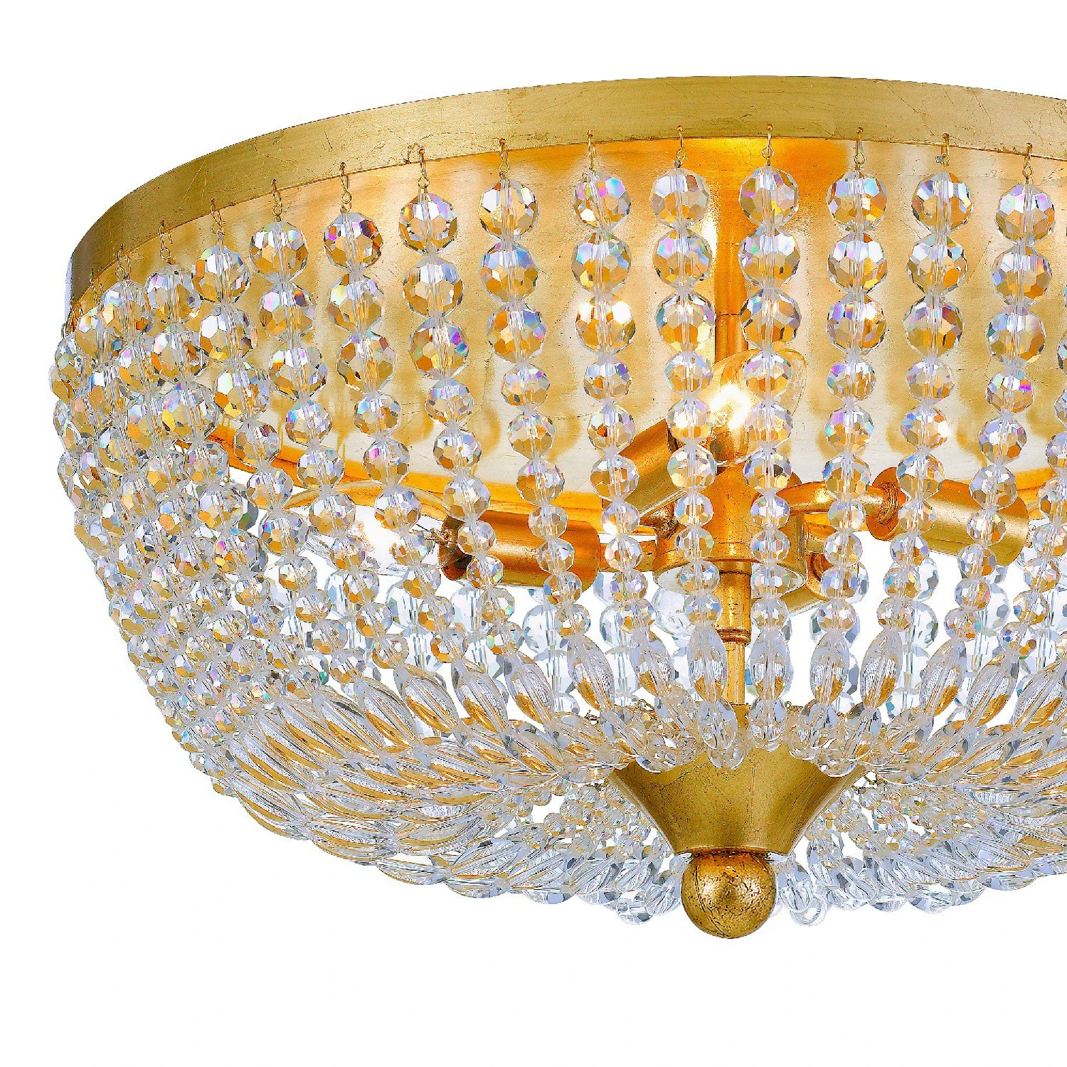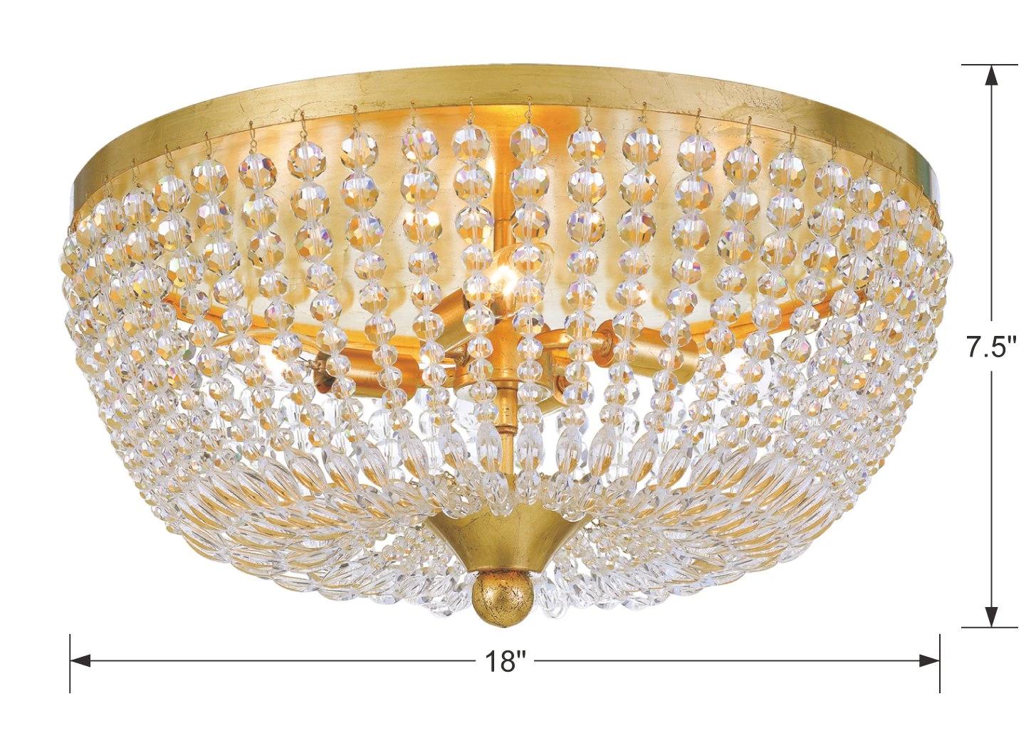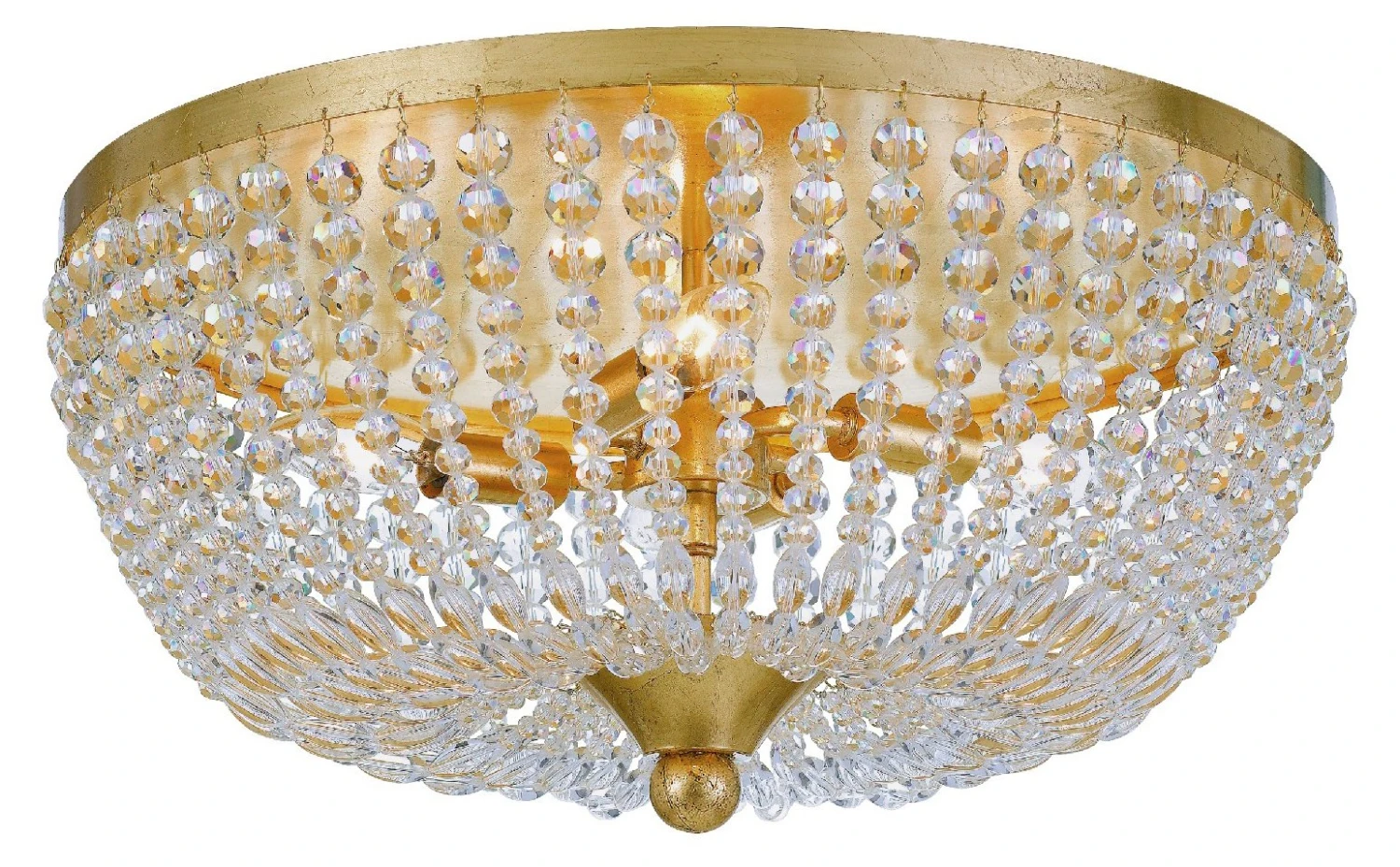 Hundreds of hand-cut crystals adorn this opulent flush mount, beautifully offset by an antiqued gold finish. Hardwired.