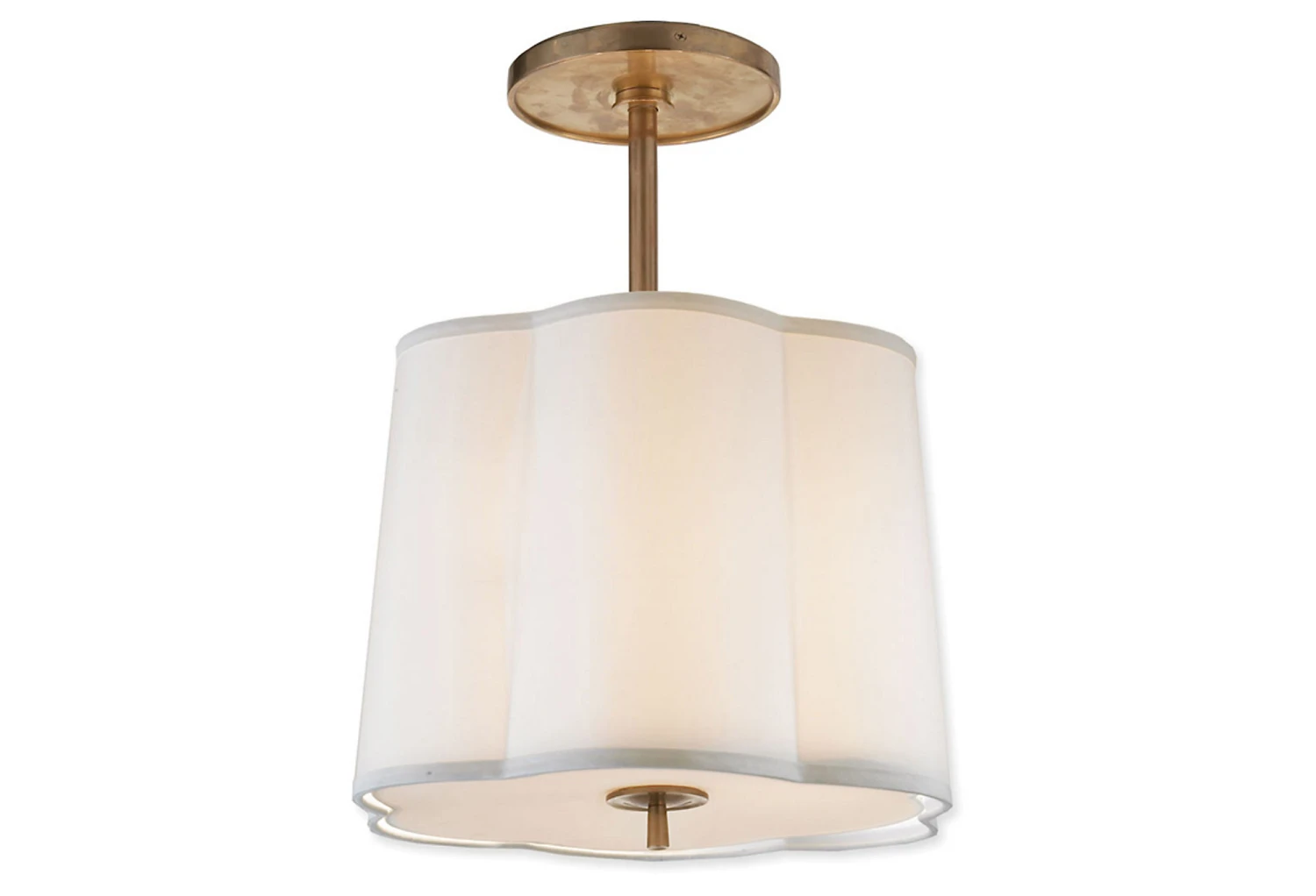 This elegant pendant is crafted of brass with a bronze finish. Its scalloped silk shade adds a charming touch. Hardwired.