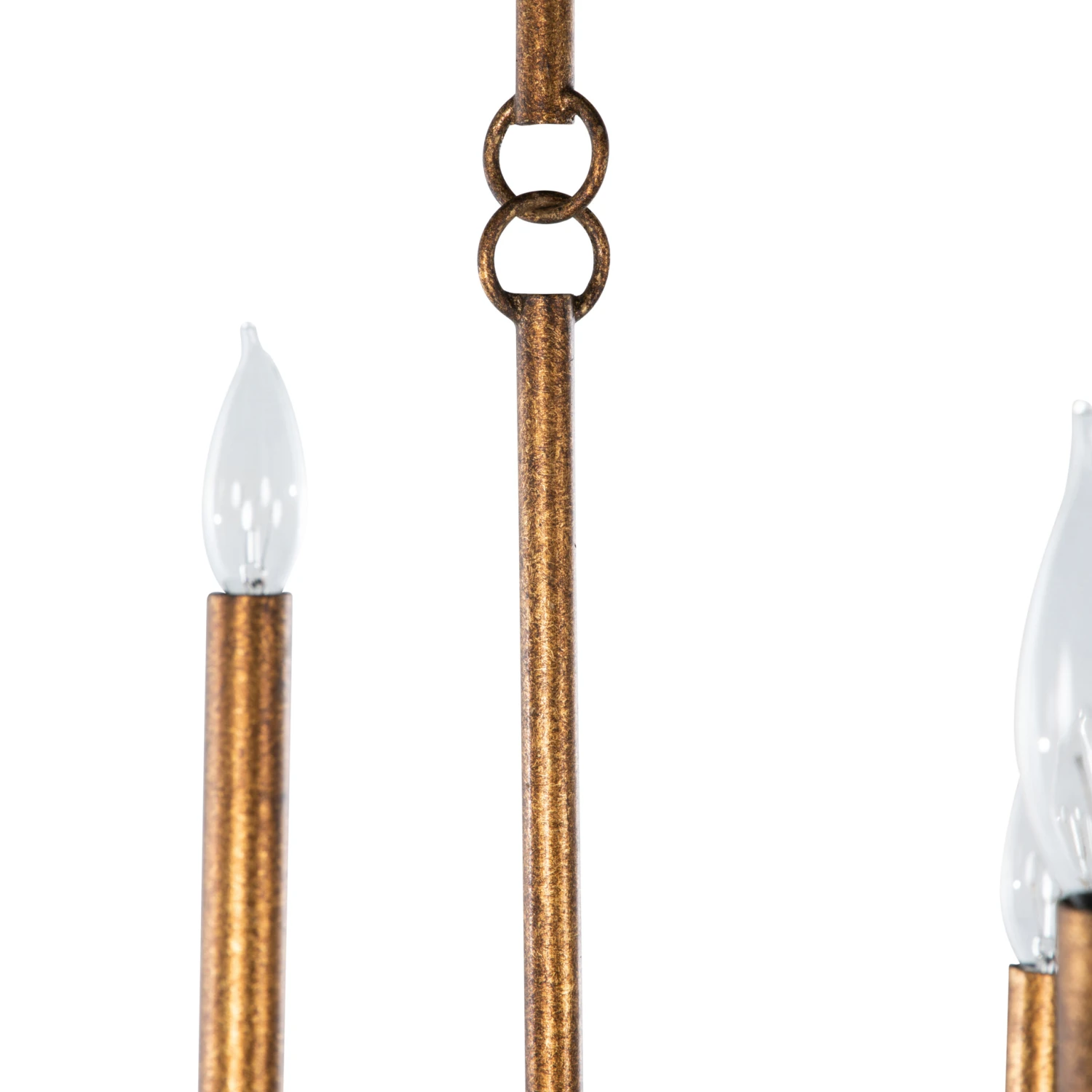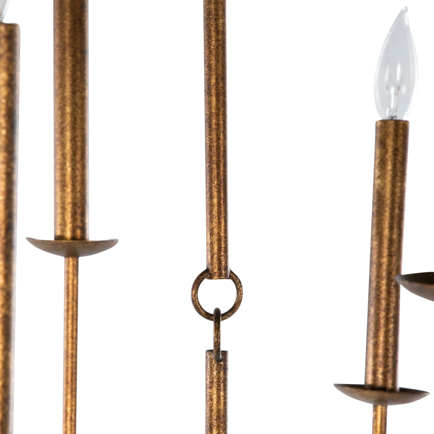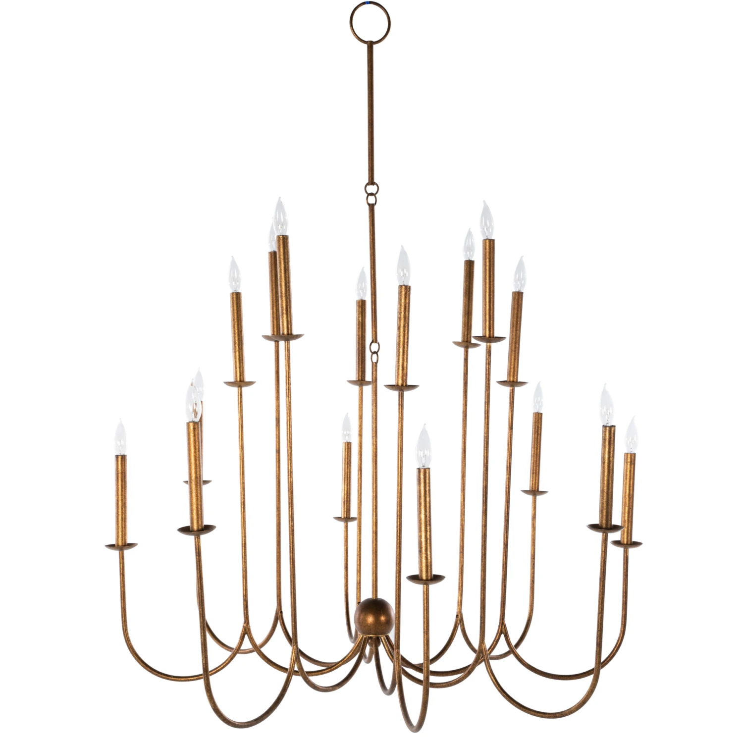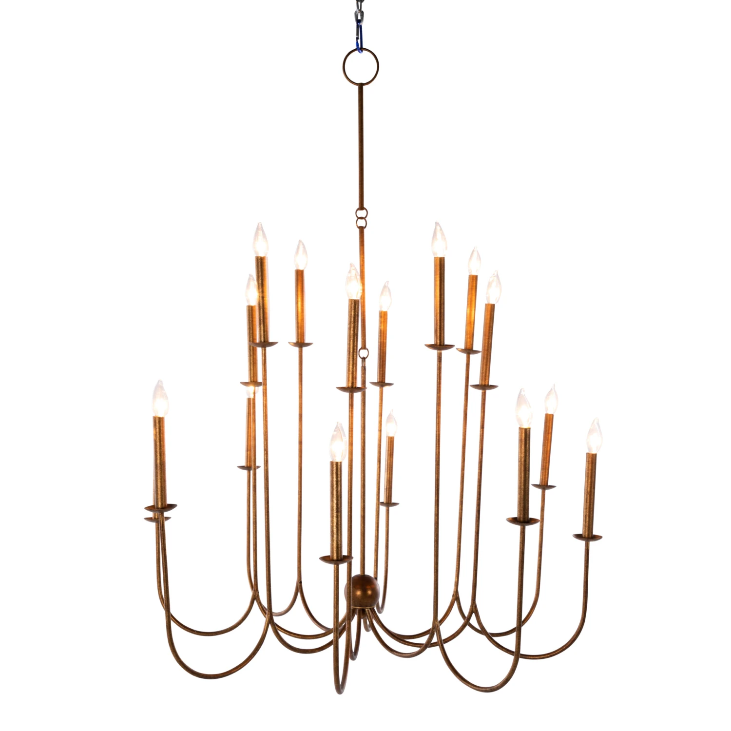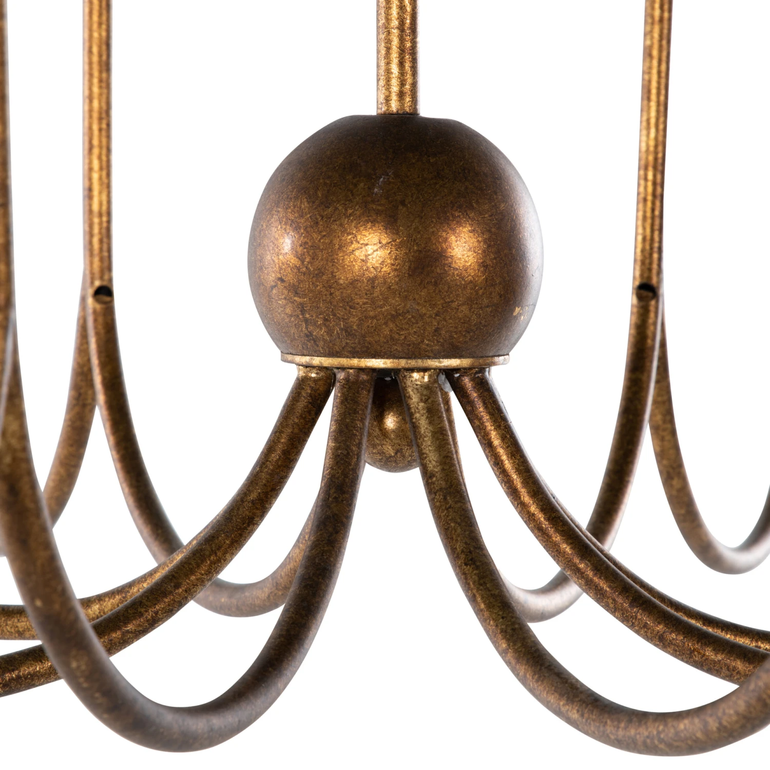 Eight slender arms, each of which holds two bulbs, extend from a center globe at varying heights, creating a chandelier that provides plenty of light as well as substantial elegance. The golden finish of the iron frame ensures timeless finesse.