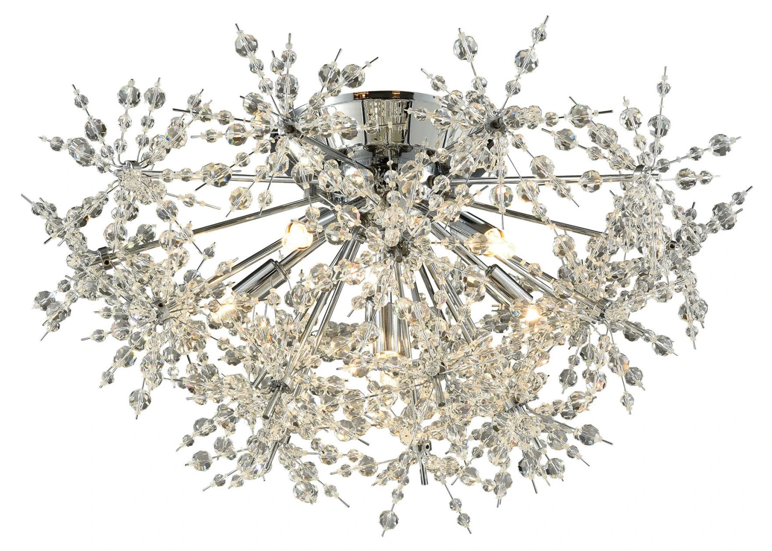 Chrome-finished steel rods radiate from this fixture’s canopy, each ending in a burst of crystal beads that resemble a snowflake. We love how this piece has a joyful feel and beautifully refracts light. Hardwired.