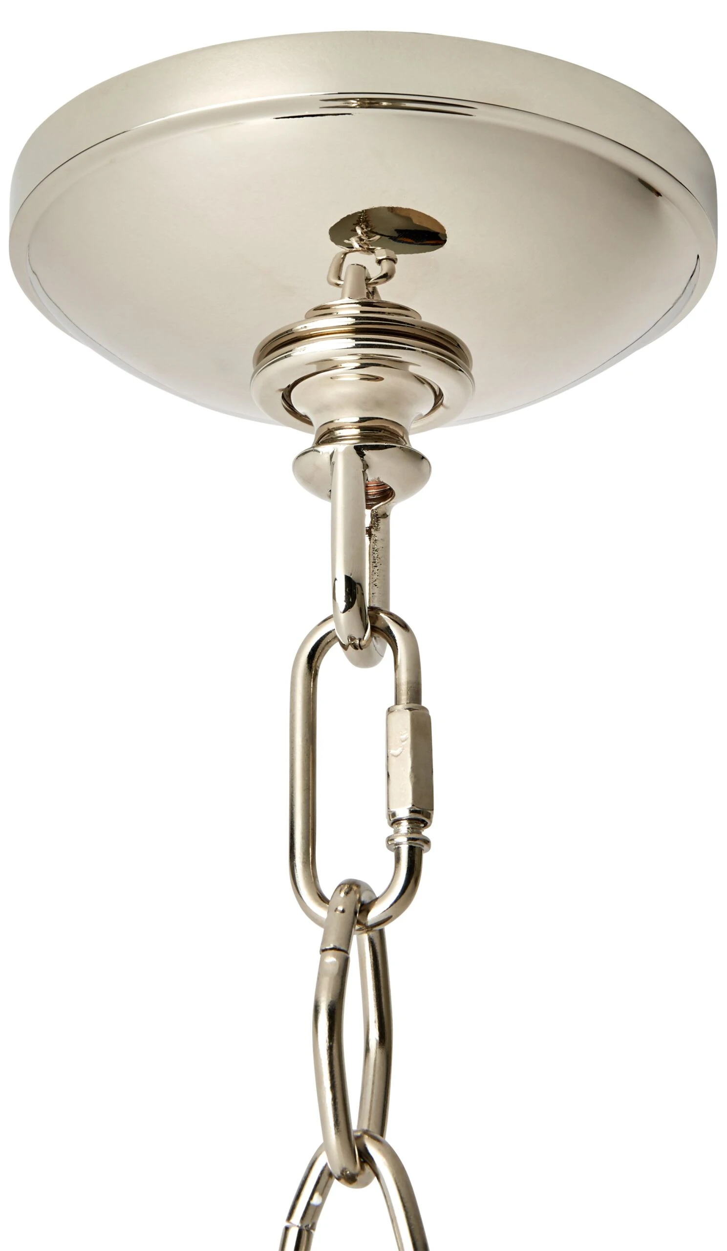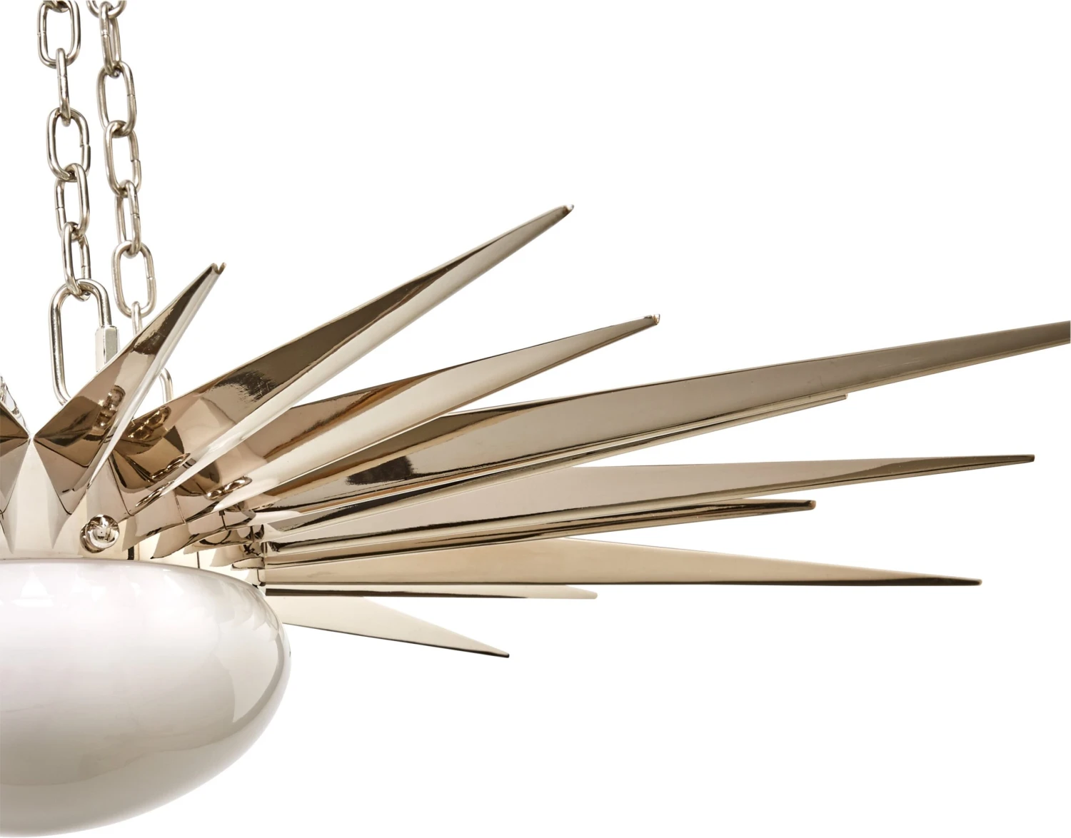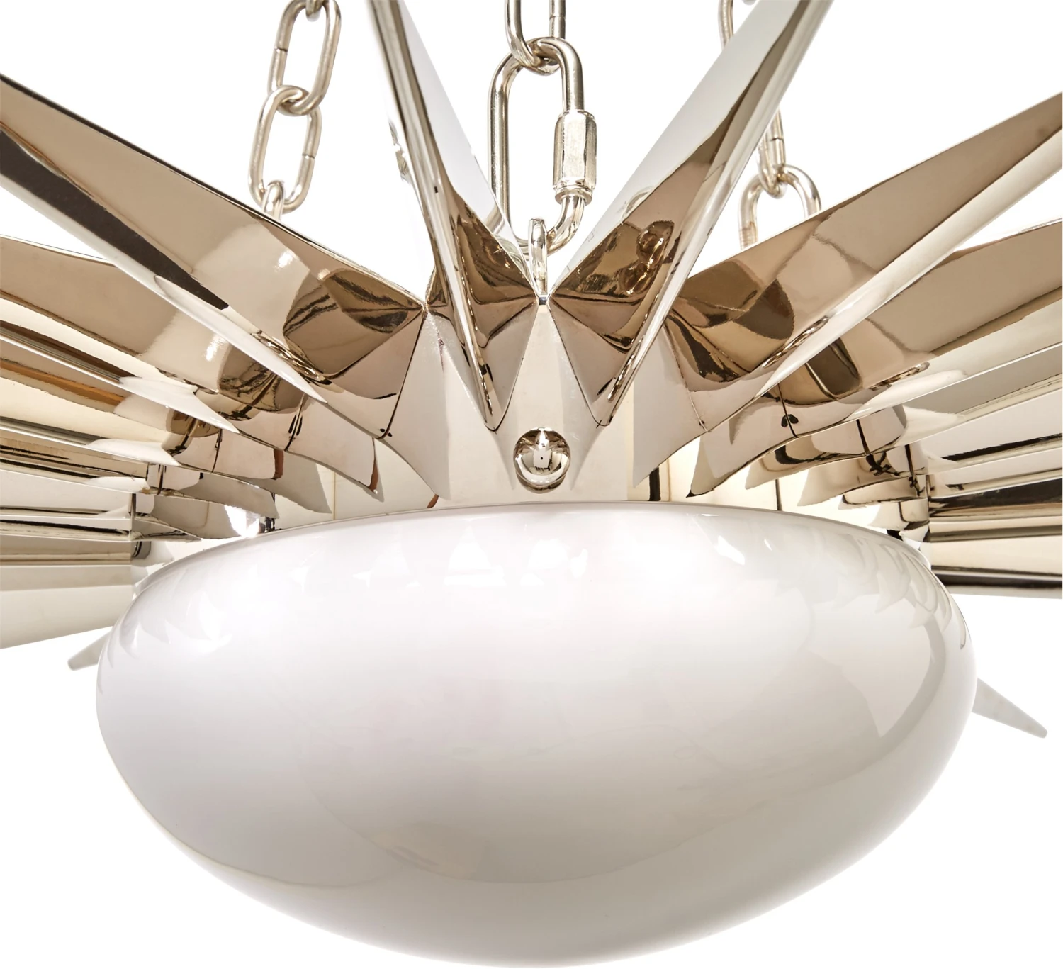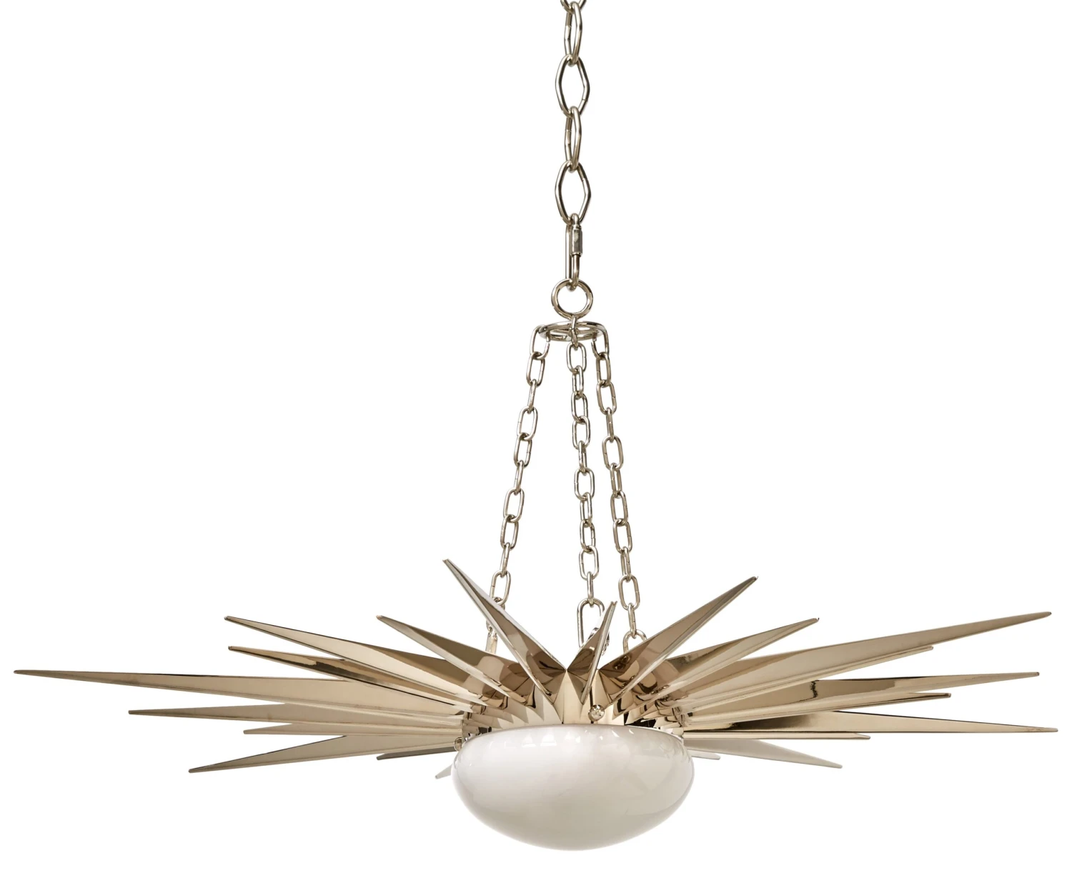 Designed by us and available only at One Kings Lane: This midcentury-inspired pendant features an impressive steel body in a classic sunburst design. A polished nickel finish completes the look and adds to this fixture’s eye-catching appeal. Hardwired.