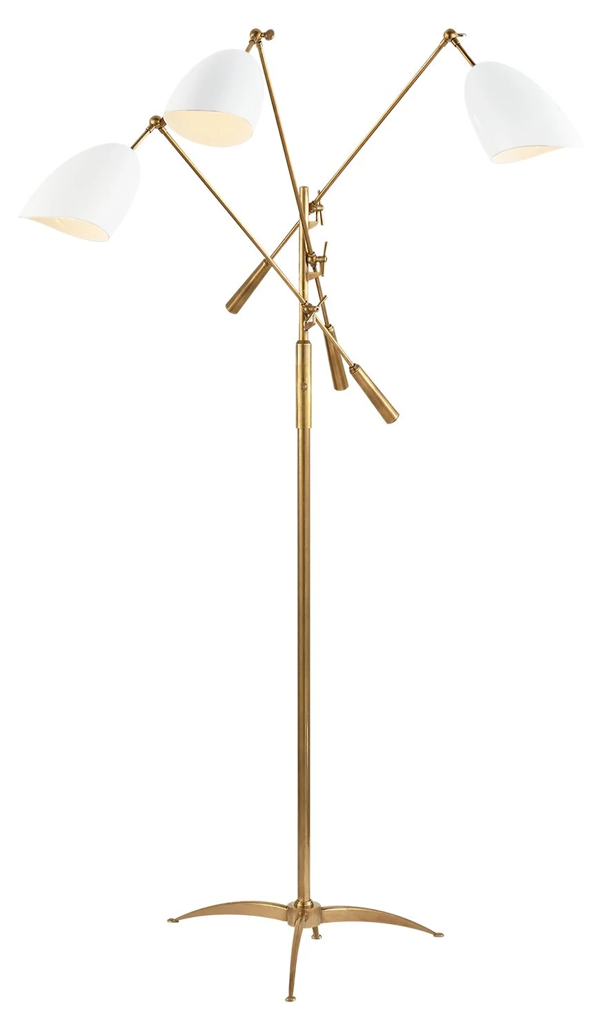 This slender floor lamp is designed with brass rods and three plaster-white shades for a clean, contemporary feel. Elbow joints allow for easy adjustment. Hardwired.