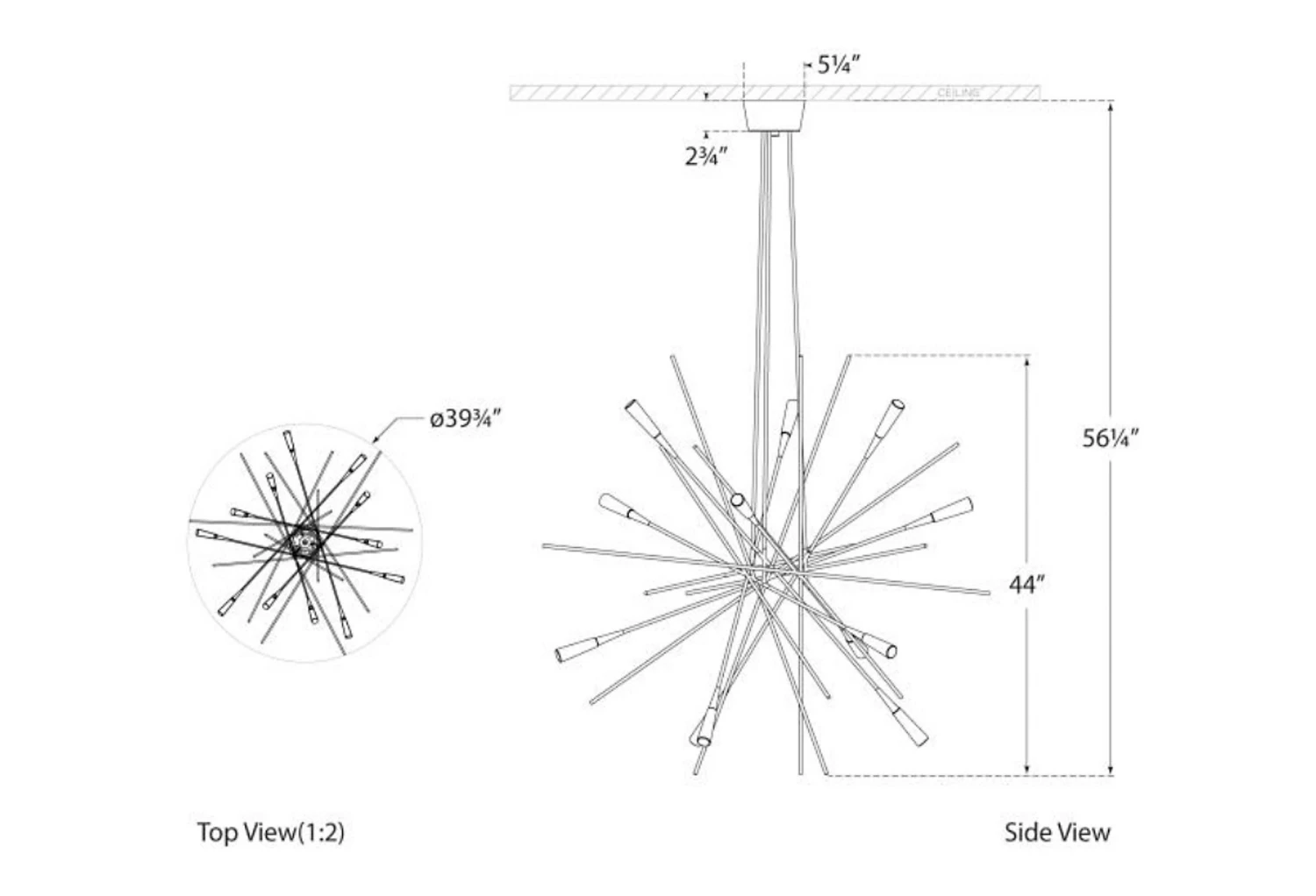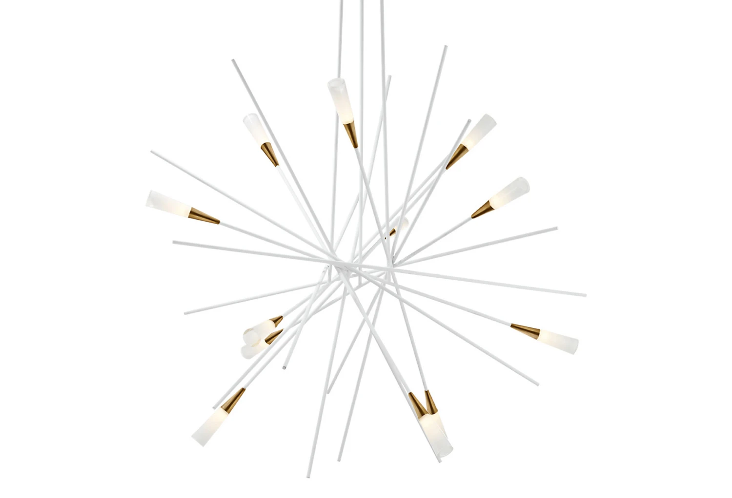 Designed by Chapman & Myers for Visual Comfort: A modern take on a classic Sputnik-style fixture, this chandelier pairs a sunburst of frosted acrylic rods with a matte white finish. Hardwired.