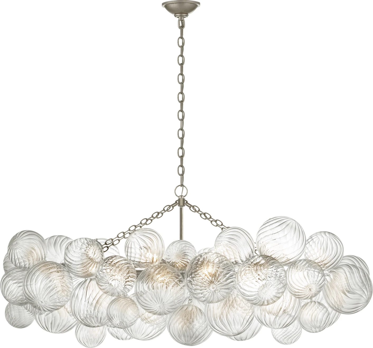 This eight-bulb chandelier calls to mind the frothy bubbles of a just-poured flute of champagne. Glass globes of various sizes, each embellished with swirls, float around the metal circumference. More than four feet wide, the chandelier will transform an entry, a dining room, or a living room into the most glamorous space in the home.