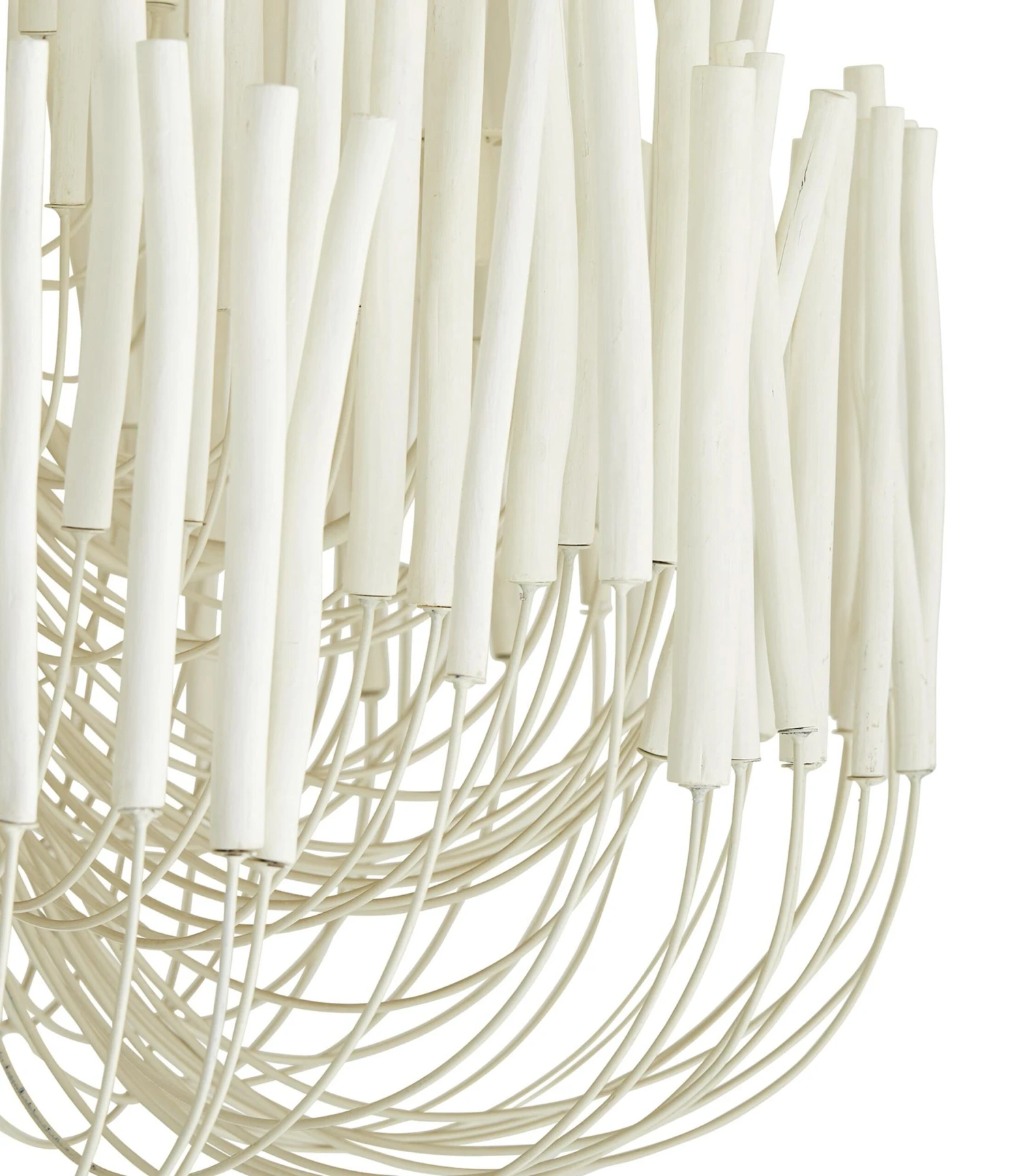 Showcasing masterful craftsmanship, this whitewashed, six-light chandelier emits a soft glow behind several tiers of hand-carved wooden spokes fixed to pliable, curved iron arms. Because this item is handmade from natural materials, variations in color, pattern, and texture may occur. Hardwired.