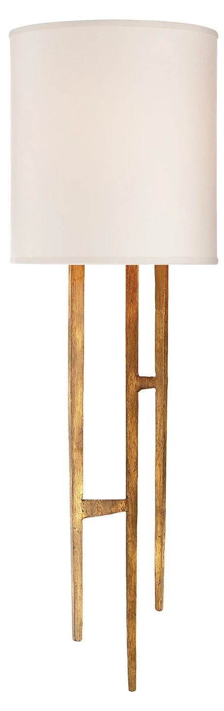 Topped with an off-white paper shade, this sconce is crafted of iron with a modern, sculptural form and gilded finish. Hardwired.