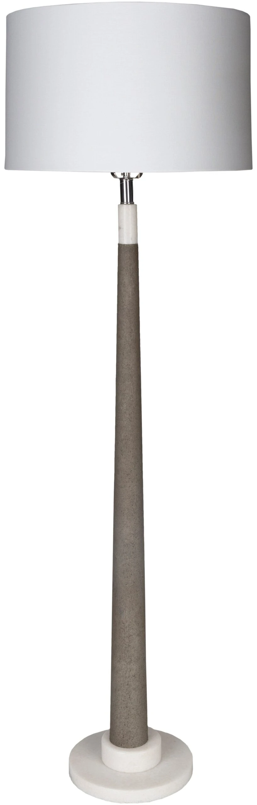 Sleek and modern in marble and iron, this floor lamp boasts a circular, stepped pedestal, flared neck, and classic drum shade.
