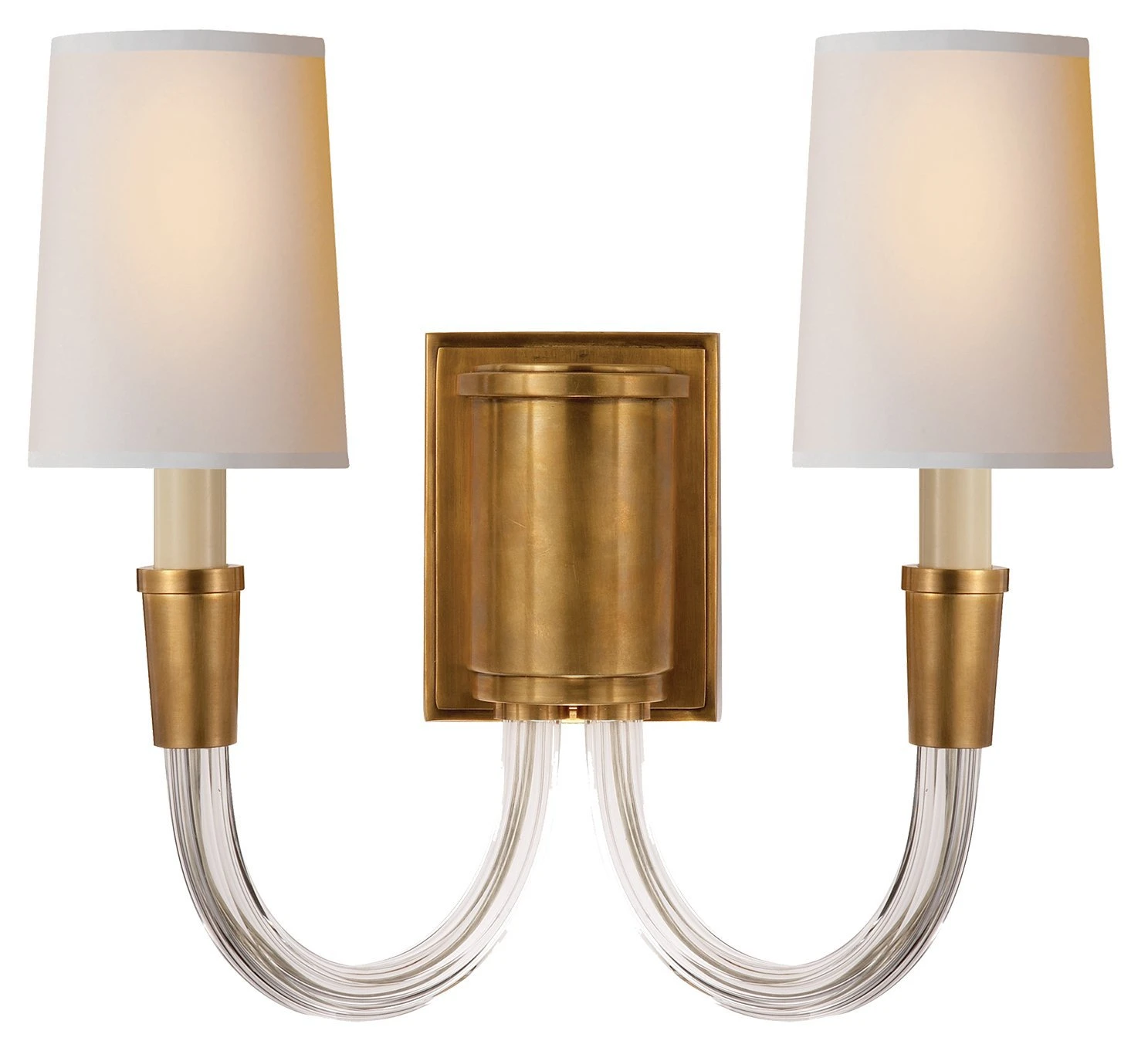 Sleek, chic, and contemporary, this sinuous sconce features two curvy crystal arms and warm pops of brass. Topped with two crisp paper shades. Designed by Thomas O’Brien. Hardwired.