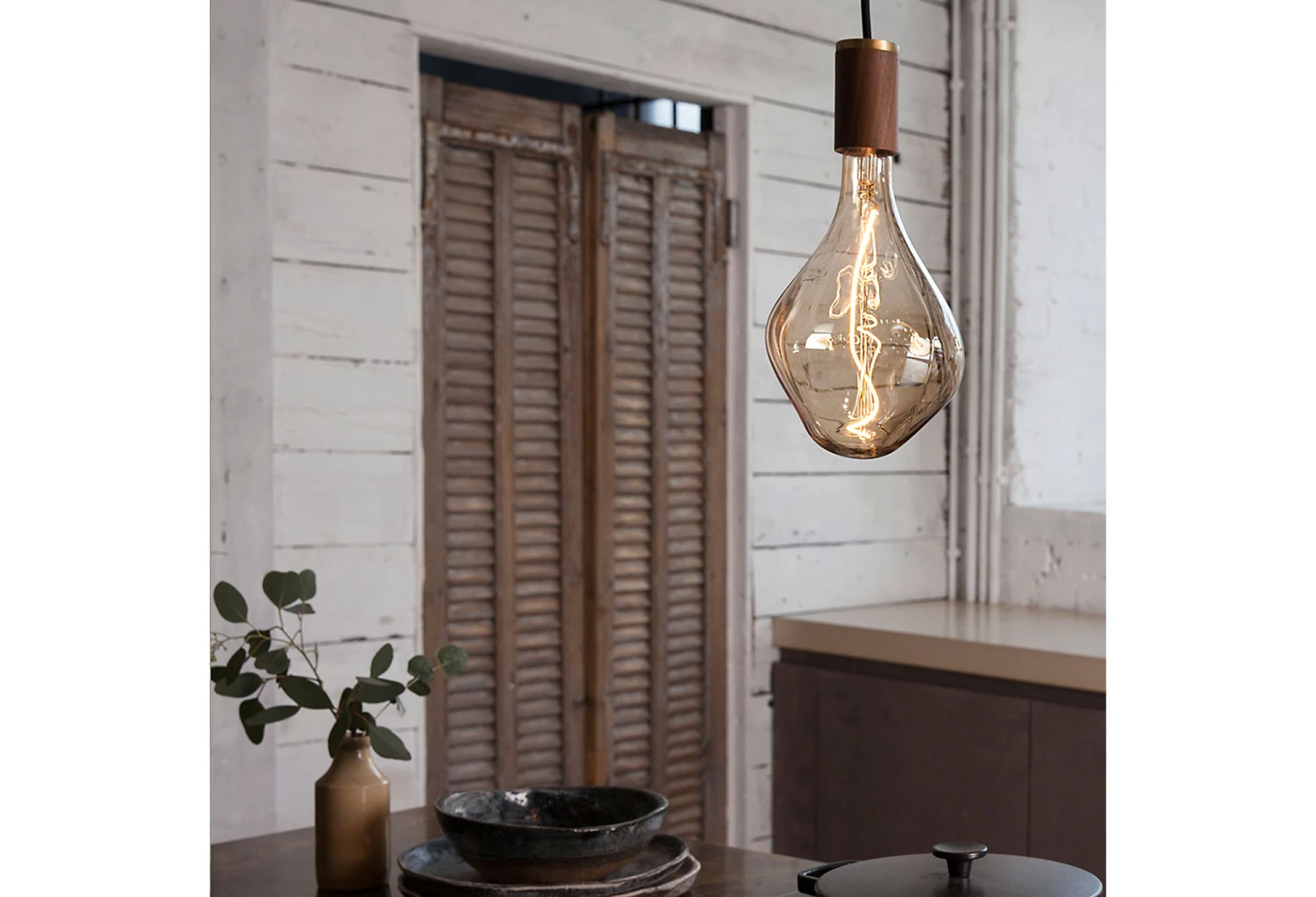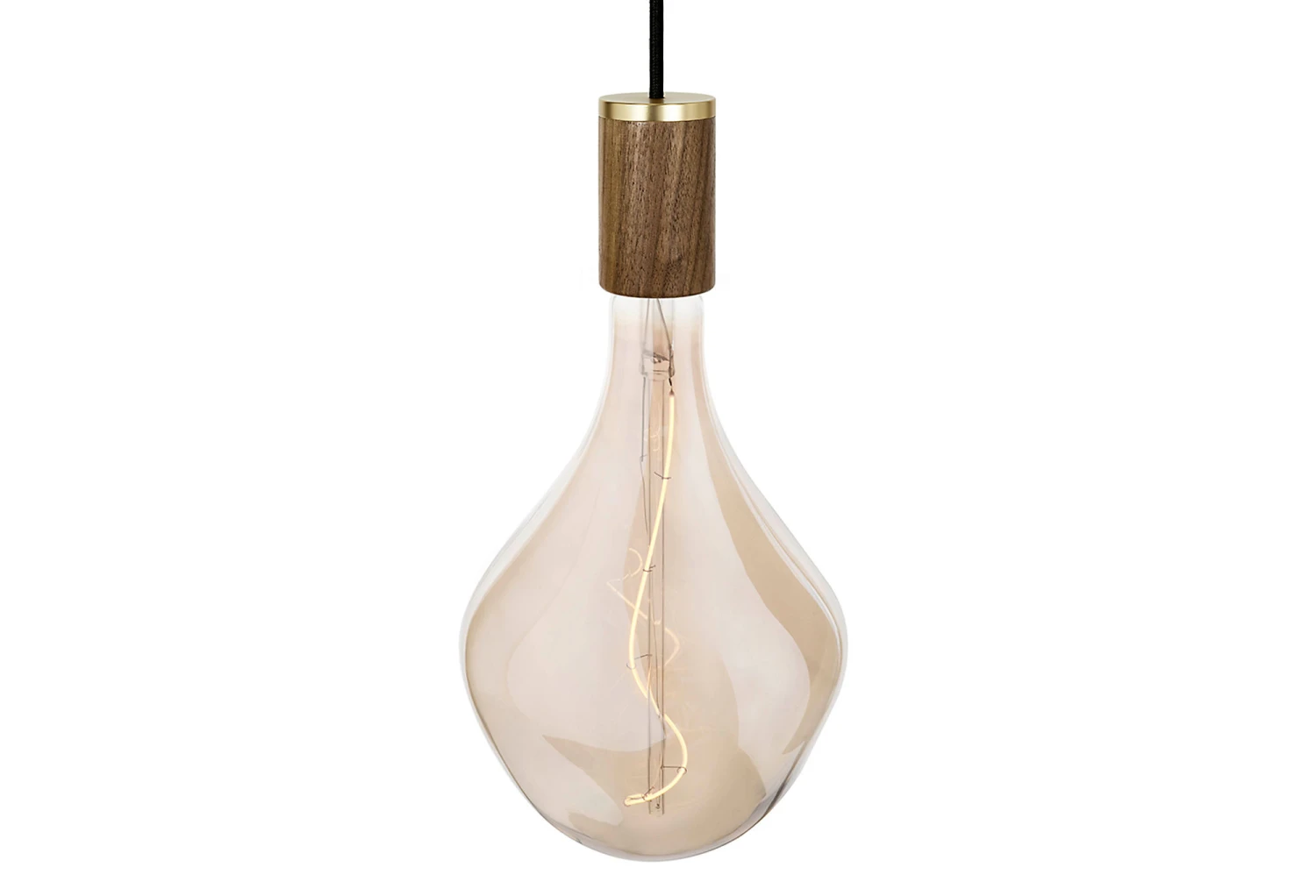This simple pendant shows off the mouth-blown bulb and its spiral filament, designed to mimic the Fibonacci sequence. The glass’s slight tint ensures a soft, flattering glow, while the walnut trim accentuates the bulb’s organic shape. With an equivalent incandescent power of 14W, this 3W LED bulb can reduce energy usage by up to 90%.