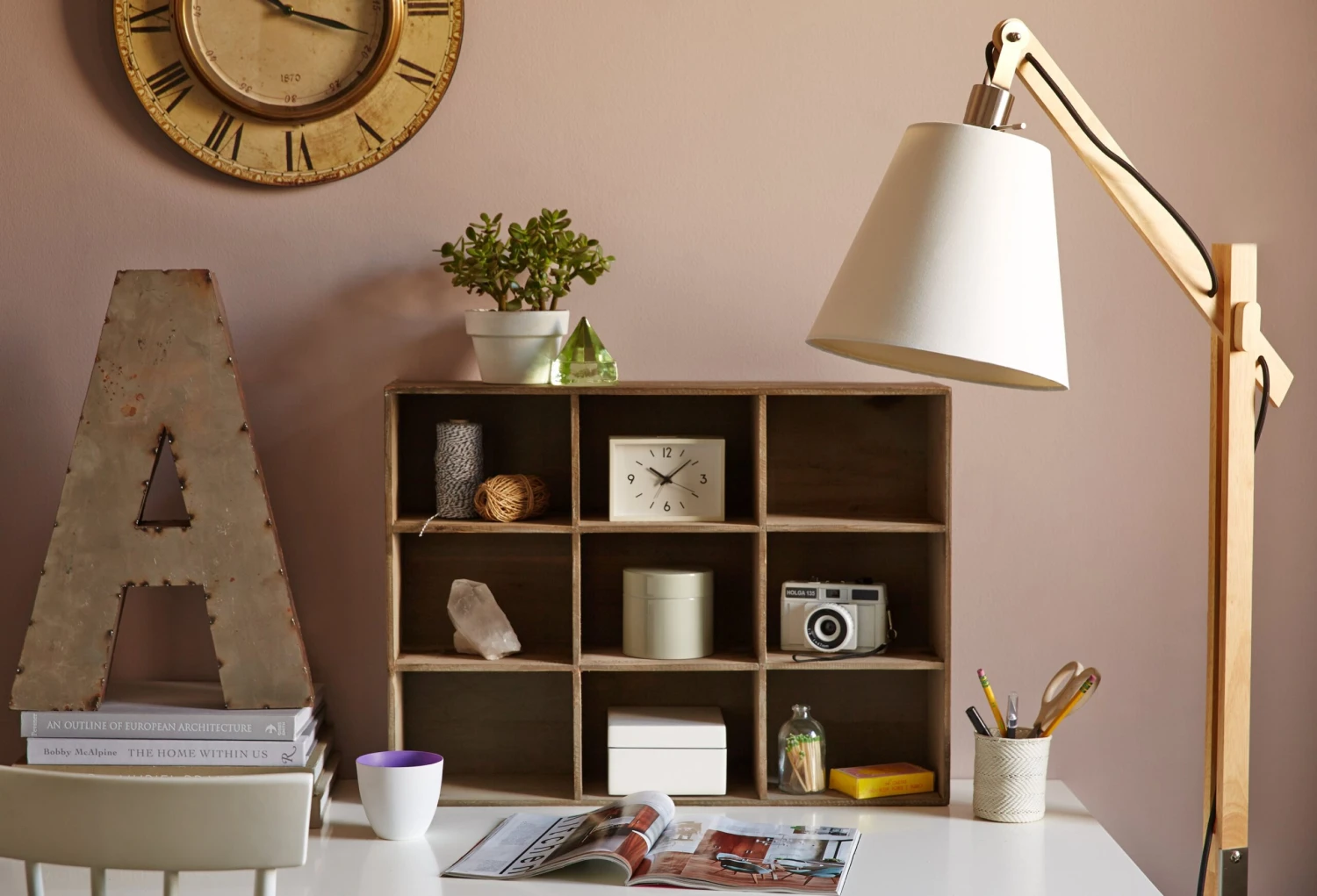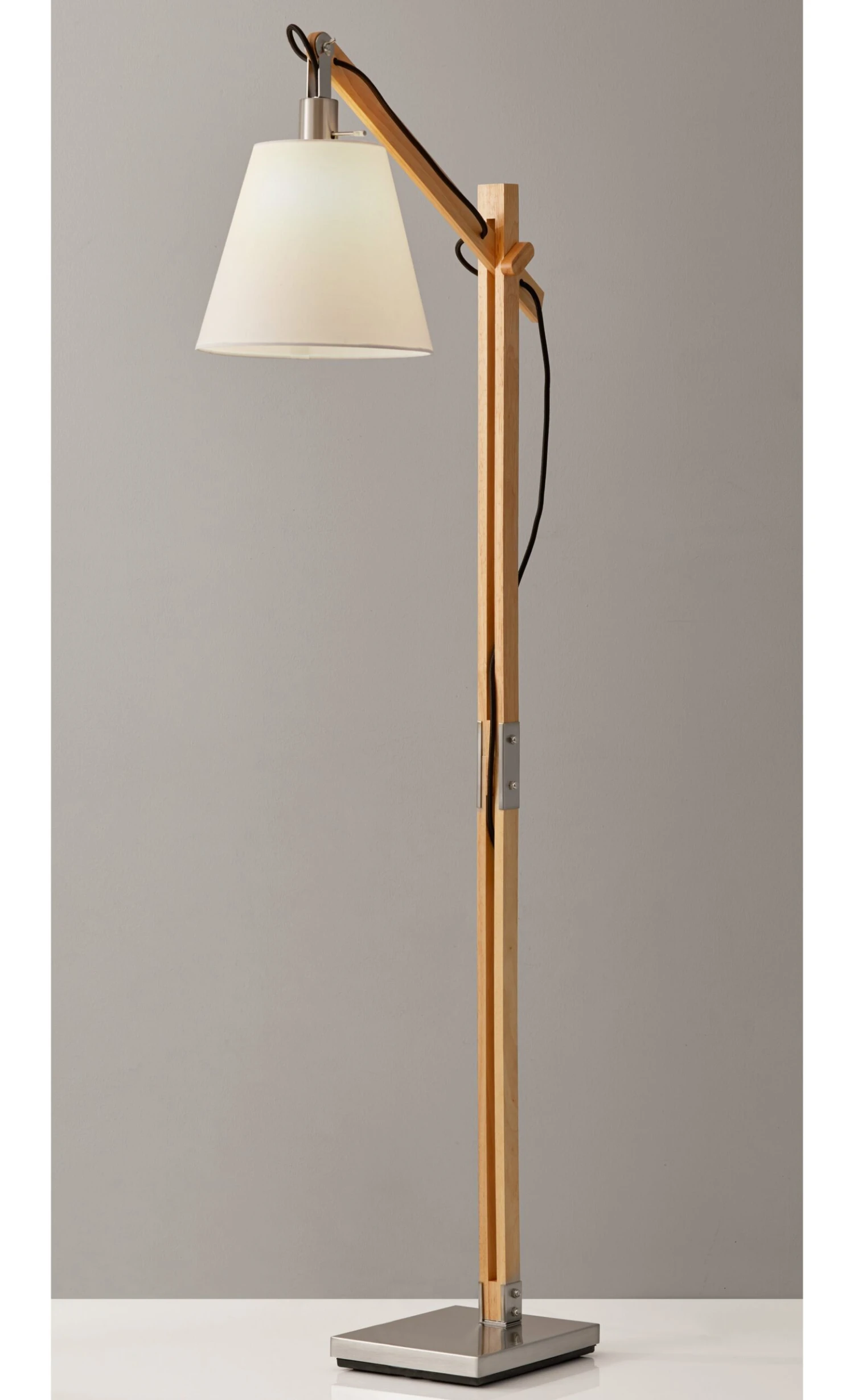This wood lamp has a modified balance arm and wood pegs for adjusting shade height and angle. The square post has an open channel through which the black fabric power cord is threaded and hangs out the back for an industrial look. The lamp is completed by an off-white bell shade.