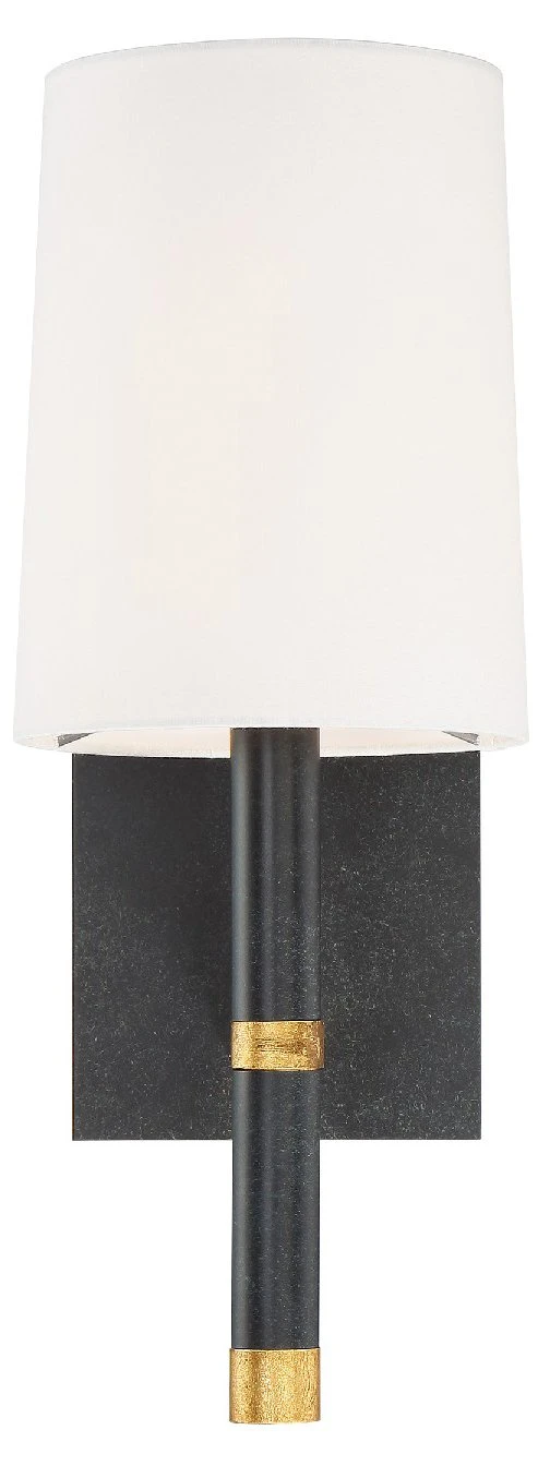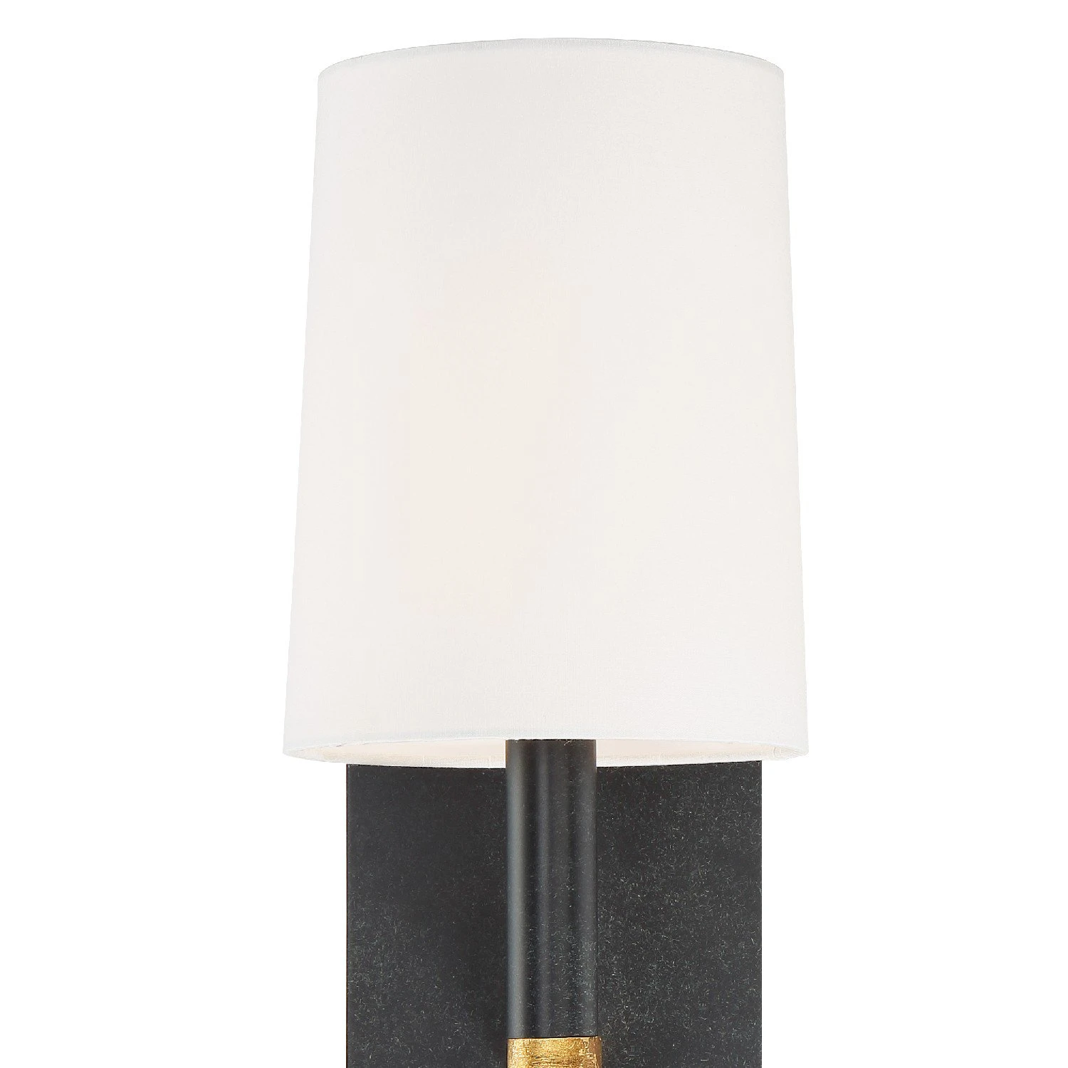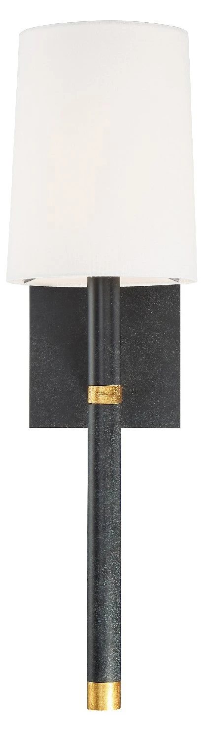 Sure to add a timeless elegance to any room, this adjustable sleek steel sconce enjoys a handsome black and antiqued gold finish on its clean-lined design. A white silk shade is a simple yet impactful finishing touch. Hardwired.